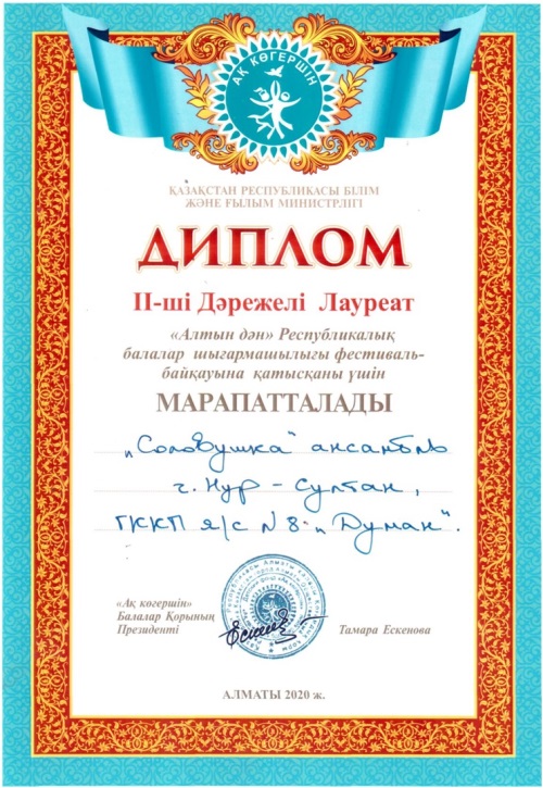 За участие в дистанционном фестиваль - конкурсе детского творчества «Алтын дән» Республиканского в творческого проекте «Ақ қөгершін»